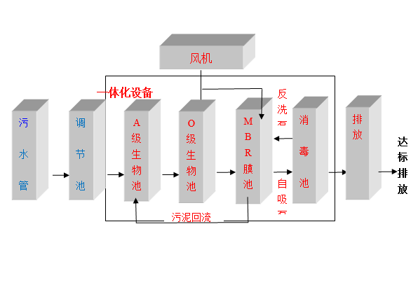 本一體化污水處理設備。工藝描述如下:接自污水管網的污水經過調節(jié)池均質、均量后,通過提升泵輸送到一體化污水處理平臺。一體化處理平臺經過厭氧、好氧及MBR膜+消毒后,然后達標排放。工藝流程圖如下: