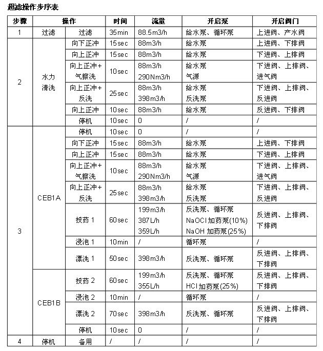 水力清洗步序:向下正沖(15sec)→向上正沖(15sec)→向上正沖+氣擦洗(10sec)→向上正 沖+反洗(25sec)→向上正沖(10sec)/返回過濾(不含泵的啟停和閥門開關(guān)時(shí)間)。