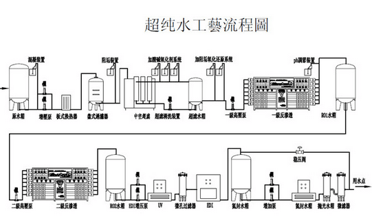 多介質(zhì)過(guò)濾+ +活性炭過(guò)濾+一級(jí)RO+軟化+二級(jí)RO+EDI